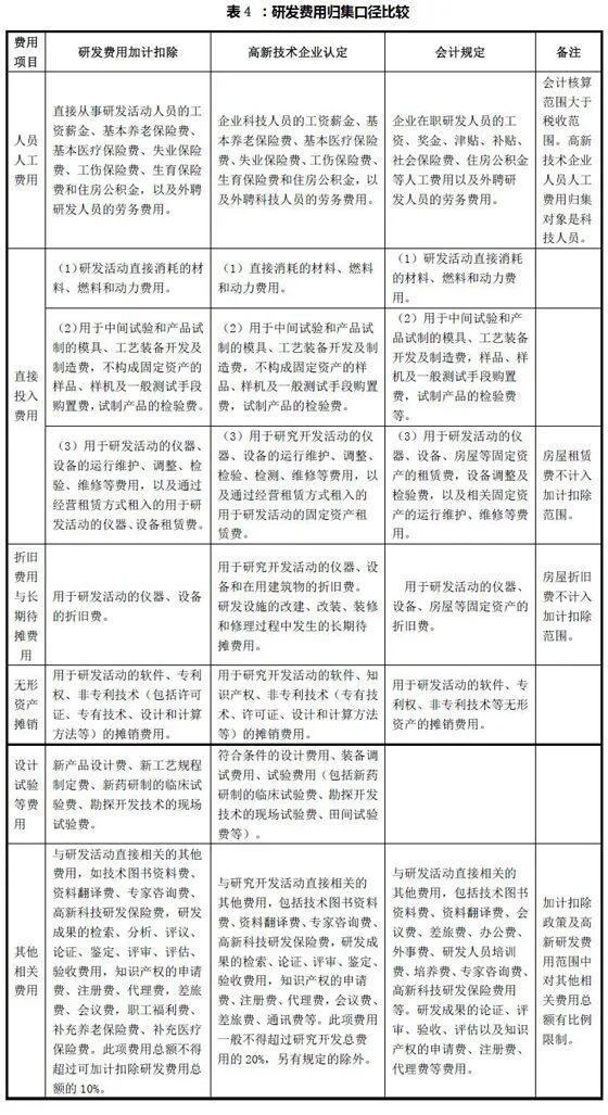 三是研发费用加计扣除政策口径的研发费用,其主要目的是为了细化哪些研发费用可以享受加计扣除政策,引导企业加大核心研发投入,因此政策口径最小。可加计范围针对企业核心研发投入,主要包括研发直接投入和相关性较高的费用,对其他费用有一定的比例限制。应关注的是,允许扣除的研发费用范围采取的是正列举方式,即政策规定中没有列举的加计扣除项目,不可以享受加计扣除优惠。