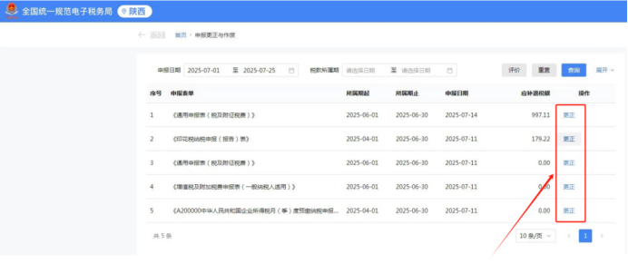 进入【申报更正与作废】界面后,选择申报日期范围、税款所属期等筛选条件,点击【查询】查询已完成申报的申报表信息,从查询结果列表中,点击【更正】,跳转相应模块进行操作,更正成功后会弹出相应提示。