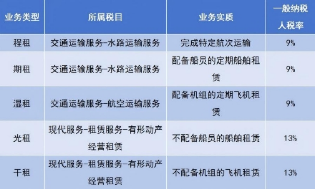 增值税一般纳税人提供程租、期租或湿租服务属于交通运输服务(税率:9%)