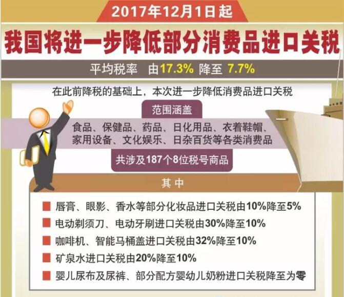 财政部近日发布消息,从12月1日起,我国将进一步降低部分消费品进口关税,平均税率由17.3%降至7.7%。