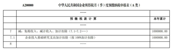预缴申报时,在《中华人民共和国企业所得税月(季)度预缴纳税申报表(A类)》(A200000)第7行“减:免税收入、减计收入、加计扣除”下的明细行次填报相关加计扣除情况。手工申报的,在明细行次填写“企业投入基础研究支出加计扣除(按100%加计扣除)”事项名称及优惠金额。通过电子税务局申报的,可直接在下拉菜单中选择相应的优惠事项名称,并填报优惠金额。相关优惠事项名称和优惠金额填报要求可参见国家税务总局网站发布的《企业所得税申报事项目录》。