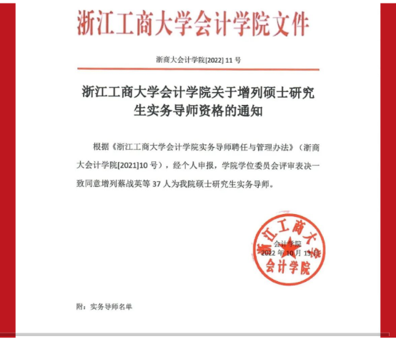 Time:2022-10-14近日,经个人申报、浙江省总会计师协会推荐,我所IM体育所长被增列为浙江工商大学会计学院硕士研究生实务导师。