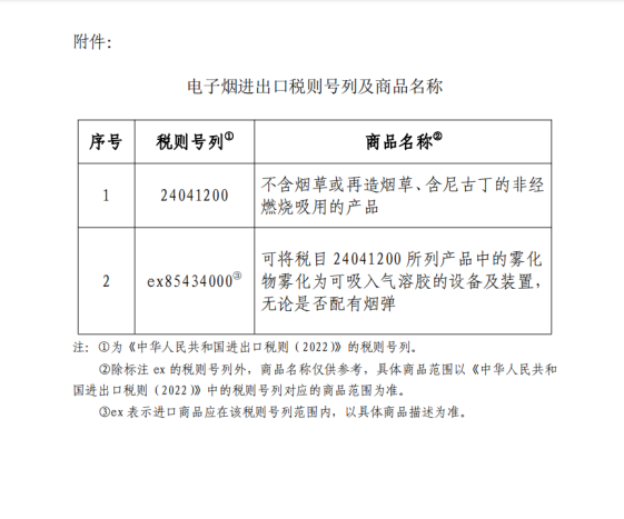 电子烟进出口税则号列及商品名称见附件。