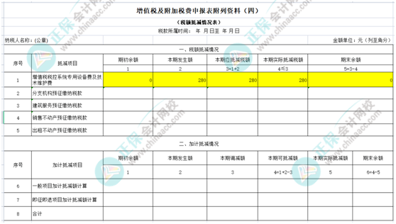 ②《增值税及附加税费申报表附列资料(四)》:在第一行“增值税税控系统专用设备费及技术维护费”处填写。