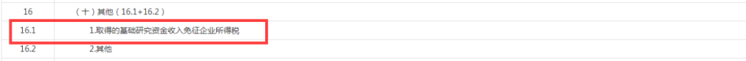 关注点③该表第16.1行享受免征企业所得税的适用主体是非营利性科研机构、高等学校,其接收企业、个人和其他组织机构基础研究资金收入时可免征。