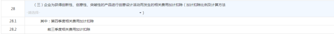 2.根据《财政部税务总局科技部关于加大支持科技创新税前扣除力度的公告》(2022年第28号)将第28行中的“加计扣除比例____%”调整为“加计扣除比例及计算方法:____”,并相应增加创意设计活动加计扣除比例及计算方法代码表,供纳税人根据相关政策选择填报适用的加计扣除比例和计算方法;并增加第28.1行“第四季度相关费用加计扣除”和第28.2行“前三季度相关费用加计扣除”,供纳税人填报2022年第四季度和前三季度创意设计活动相关费用加计扣除金额。