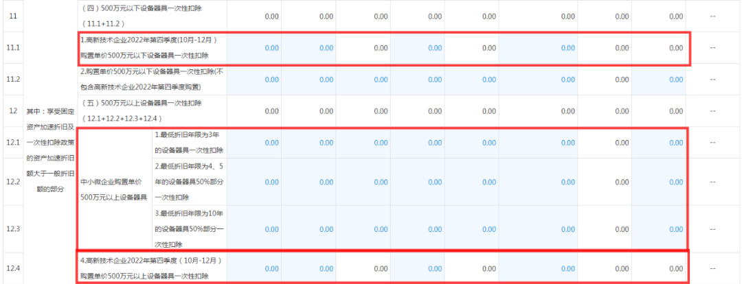 1.根据《财政部税务总局科技部关于加大支持科技创新税前扣除力度的公告》(2022年第28号)新增第11.1行“高新技术企业2022年第四季度(10月-12月)购置单价500万元以下设备器具一次性扣除”;新增第12.4行“高新技术企业2022年第四季度(10月-12月)购置单价500万元以上设备器具一次性扣除”供高新技术企业填报购置设备器具扣除相关优惠政策金额;