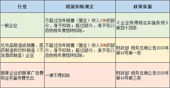 汇总一下目前的广告费和业务宣传费支出税前扣除比例及政策,内容如下: